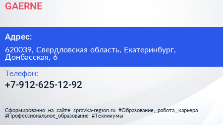GAERNE по адресу 620039, Свердловская область, Екатеринбург, Донбасская, 6 в дальнейшем Организация, размещена в следующих категориях: