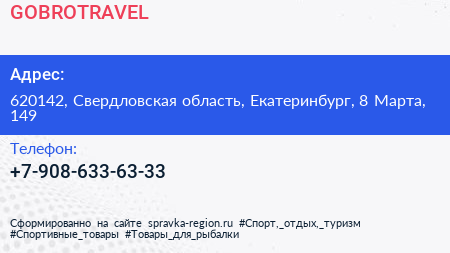 GOBROTRAVEL по адресу 620142, Свердловская область, Екатеринбург, 8 Марта, 149 в дальнейшем Организация, размещена в следующих категориях: