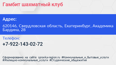 Гамбит, шахматный клуб по адресу 620146, Свердловская область, Екатеринбург, Академика Бардина, 28 в дальнейшем Организация, размещена в следующих категориях: