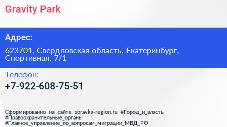 Gravity Park по адресу 623701, Свердловская область, Екатеринбург, Спортивная, 7/1 в дальнейшем Организация, размещена в следующих категориях: