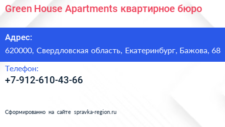 Green House Apartments, квартирное бюро по адресу 620000, Свердловская область, Екатеринбург, Бажова, 68 в дальнейшем Организация, размещена в следующих категориях: