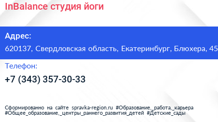 InBalance, студия йоги по адресу 620137, Свердловская область, Екатеринбург, Блюхера, 45 в дальнейшем Организация, размещена в следующих категориях: