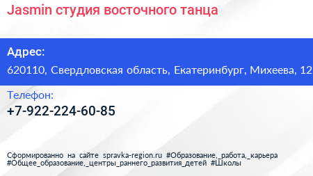 Jasmin, студия восточного танца по адресу 620110, Свердловская область, Екатеринбург, Михеева, 12 в дальнейшем Организация, размещена в следующих категориях: