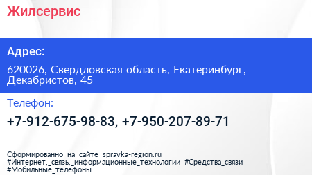Жилсервис по адресу 620026, Свердловская область, Екатеринбург, Декабристов, 45 в дальнейшем Организация, размещена в следующих категориях: