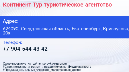 Континент Тур, туристическое агентство по адресу 624090, Свердловская область, Екатеринбург, Кривоусова, 20а в дальнейшем Организация, размещена в следующих категориях: