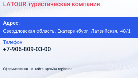 LATOUR, туристическая компания по адресу Свердловская область, Екатеринбург, Латвийская, 48/1 в дальнейшем Организация, размещена в следующих категориях: