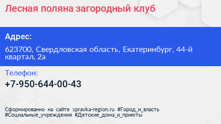 Лесная поляна, загородный клуб по адресу 623700, Свердловская область, Екатеринбург, 44-й квартал, 2а в дальнейшем Организация, размещена в следующих категориях:
