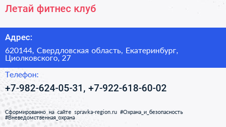 Летай, фитнес-клуб по адресу 620144, Свердловская область, Екатеринбург, Циолковского, 27 в дальнейшем Организация, размещена в следующих категориях: