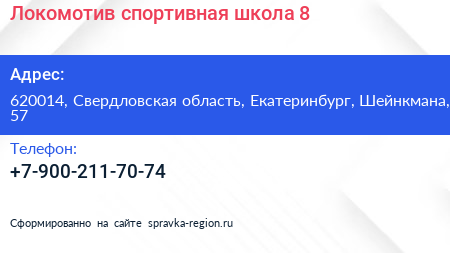 Локомотив, спортивная школа №8 по адресу 620014, Свердловская область, Екатеринбург, Шейнкмана, 57 в дальнейшем Организация, размещена в следующих категориях: