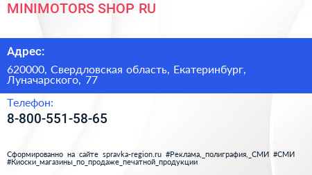 MINIMOTORS-SHOP.RU по адресу 620000, Свердловская область, Екатеринбург, Луначарского, 77 в дальнейшем Организация, размещена в следующих категориях: