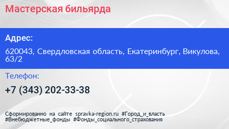 Мастерская бильярда по адресу 620043, Свердловская область, Екатеринбург, Викулова, 63/2 в дальнейшем Организация, размещена в следующих категориях: