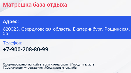 Матрешка, база отдыха по адресу 620023, Свердловская область, Екатеринбург, Рощинская, 55 в дальнейшем Организация, размещена в следующих категориях: