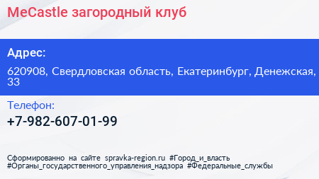 MeCastle, загородный клуб по адресу 620908, Свердловская область, Екатеринбург, Денежская, 33 в дальнейшем Организация, размещена в следующих категориях: