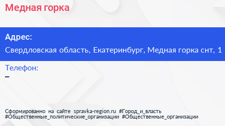 Медная горка по адресу Свердловская область, Екатеринбург, Медная горка снт, 1 в дальнейшем Организация, размещена в следующих категориях: