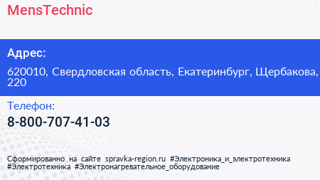 MensTechnic по адресу 620010, Свердловская область, Екатеринбург, Щербакова, 220 в дальнейшем Организация, размещена в следующих категориях: