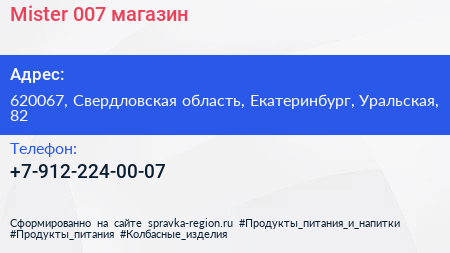 Mister 007, магазин по адресу 620067, Свердловская область, Екатеринбург, Уральская, 82 в дальнейшем Организация, размещена в следующих категориях: