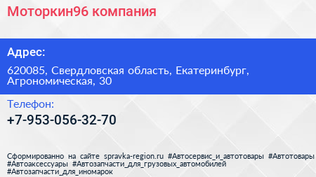 Моторкин96, компания по адресу 620085, Свердловская область, Екатеринбург, Агрономическая, 30 в дальнейшем Организация, размещена в следующих категориях: