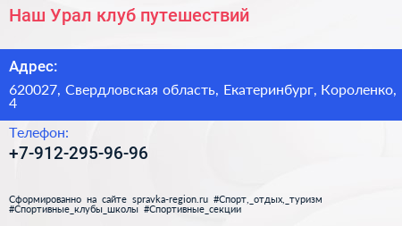Наш Урал, клуб путешествий по адресу 620027, Свердловская область, Екатеринбург, Короленко, 4 в дальнейшем Организация, размещена в следующих категориях: