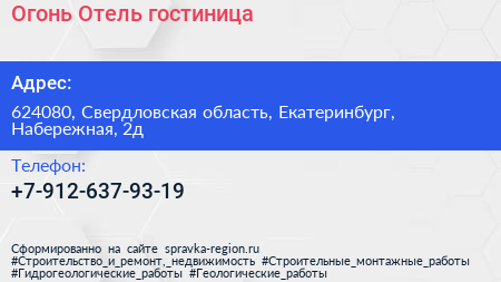 Огонь Отель, гостиница по адресу 624080, Свердловская область, Екатеринбург, Набережная, 2д в дальнейшем Организация, размещена в следующих категориях: