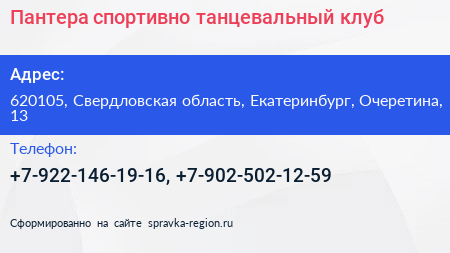 Пантера, спортивно-танцевальный клуб по адресу 620105, Свердловская область, Екатеринбург, Очеретина, 13 в дальнейшем Организация, размещена в следующих категориях: