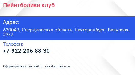 Пейнтболика, клуб по адресу 620043, Свердловская область, Екатеринбург, Викулова, 59/2 в дальнейшем Организация, размещена в следующих категориях: