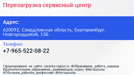 Перезагрузка, сервисный центр по адресу 620092, Свердловская область, Екатеринбург, Новгородцевой, 13Б в дальнейшем Организация, размещена в следующих категориях: