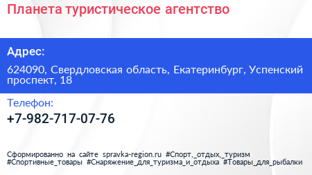 Планета, туристическое агентство по адресу 624090, Свердловская область, Екатеринбург, Успенский проспект, 18 в дальнейшем Организация, размещена в следующих категориях:
