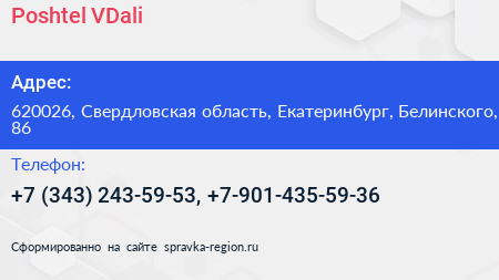 Poshtel VDali по адресу 620026, Свердловская область, Екатеринбург, Белинского, 86 в дальнейшем Организация, размещена в следующих категориях: