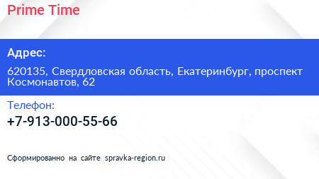 Prime Time по адресу 620135, Свердловская область, Екатеринбург, проспект Космонавтов, 62 в дальнейшем Организация, размещена в следующих категориях:
