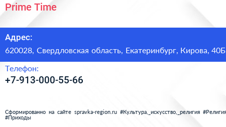 Prime Time по адресу 620028, Свердловская область, Екатеринбург, Кирова, 40Б в дальнейшем Организация, размещена в следующих категориях: