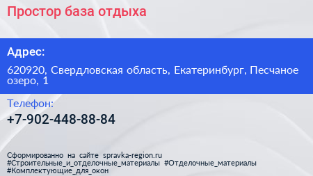 Простор, база отдыха по адресу 620920, Свердловская область, Екатеринбург, Песчаное озеро, 1 в дальнейшем Организация, размещена в следующих категориях:
