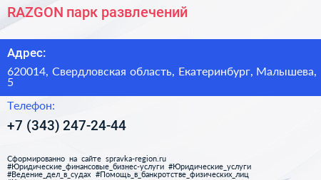RAZGON, парк развлечений по адресу 620014, Свердловская область, Екатеринбург, Малышева, 5 в дальнейшем Организация, размещена в следующих категориях: