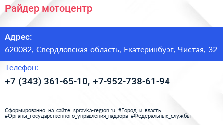 Райдер, мотоцентр по адресу 620082, Свердловская область, Екатеринбург, Чистая, 32 в дальнейшем Организация, размещена в следующих категориях:
