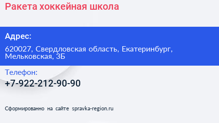 Ракета, хоккейная школа по адресу 620027, Свердловская область, Екатеринбург, Мельковская, 3Б в дальнейшем Организация, размещена в следующих категориях:
