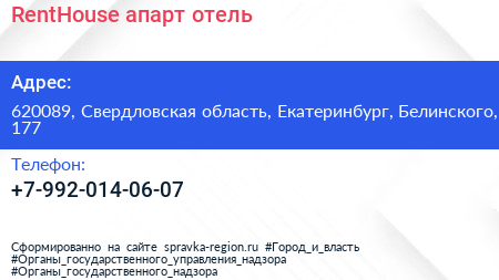 RentHouse, апарт-отель по адресу 620089, Свердловская область, Екатеринбург, Белинского, 177 в дальнейшем Организация, размещена в следующих категориях: