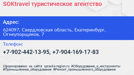 SOKtravel, туристическое агентство по адресу 624097, Свердловская область, Екатеринбург, Огнеупорщиков, 7 в дальнейшем Организация, размещена в следующих категориях: