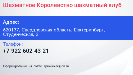 Шахматное Королевство, шахматный клуб по адресу 620137, Свердловская область, Екатеринбург, Студенческая, 3 в дальнейшем Организация, размещена в следующих категориях: