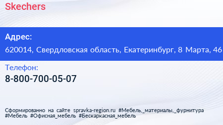 Skechers по адресу 620014, Свердловская область, Екатеринбург, 8 Марта, 46 в дальнейшем Организация, размещена в следующих категориях: