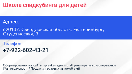 Школа спидкубинга для детей по адресу 620137, Свердловская область, Екатеринбург, Студенческая, 3 в дальнейшем Организация, размещена в следующих категориях: