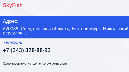 SkyFish по адресу 620039, Свердловская область, Екатеринбург, Никольский переулок, 1 в дальнейшем Организация, размещена в следующих категориях: