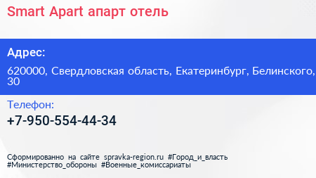 Smart Apart, апарт-отель по адресу 620000, Свердловская область, Екатеринбург, Белинского, 30 в дальнейшем Организация, размещена в следующих категориях:
