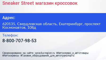 Sneaker Street, магазин кроссовок по адресу 620135, Свердловская область, Екатеринбург, проспект Космонавтов, 108д в дальнейшем Организация, размещена в следующих категориях: