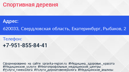 Спортивная деревня по адресу 620033, Свердловская область, Екатеринбург, Рыбаков, 2 в дальнейшем Организация, размещена в следующих категориях:
