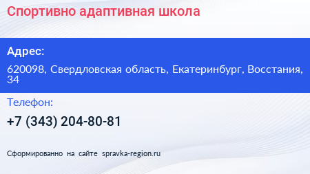 Спортивно-адаптивная школа по адресу 620098, Свердловская область, Екатеринбург, Восстания, 34 в дальнейшем Организация, размещена в следующих категориях:
