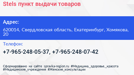 Stels, пункт выдачи товаров по адресу 620014, Свердловская область, Екатеринбург, Хомякова, 20 в дальнейшем Организация, размещена в следующих категориях: