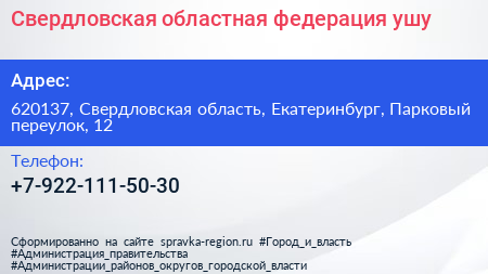 Свердловская областная федерация ушу по адресу 620137, Свердловская область, Екатеринбург, Парковый переулок, 12 в дальнейшем Организация, размещена в следующих категориях: