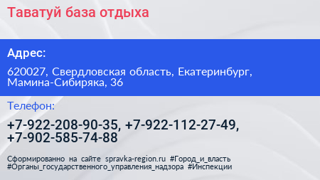 Таватуй, база отдыха по адресу 620027, Свердловская область, Екатеринбург, Мамина-Сибиряка, 36 в дальнейшем Организация, размещена в следующих категориях: