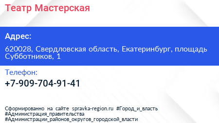 Театр-Мастерская по адресу 620028, Свердловская область, Екатеринбург, площадь Субботников, 1 в дальнейшем Организация, размещена в следующих категориях: