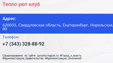Тепло, уют-клуб по адресу 620033, Свердловская область, Екатеринбург, Норильская, 80 в дальнейшем Организация, размещена в следующих категориях: