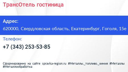 ТрансОтель, гостиница по адресу 620000, Свердловская область, Екатеринбург, Гоголя, 15е в дальнейшем Организация, размещена в следующих категориях: